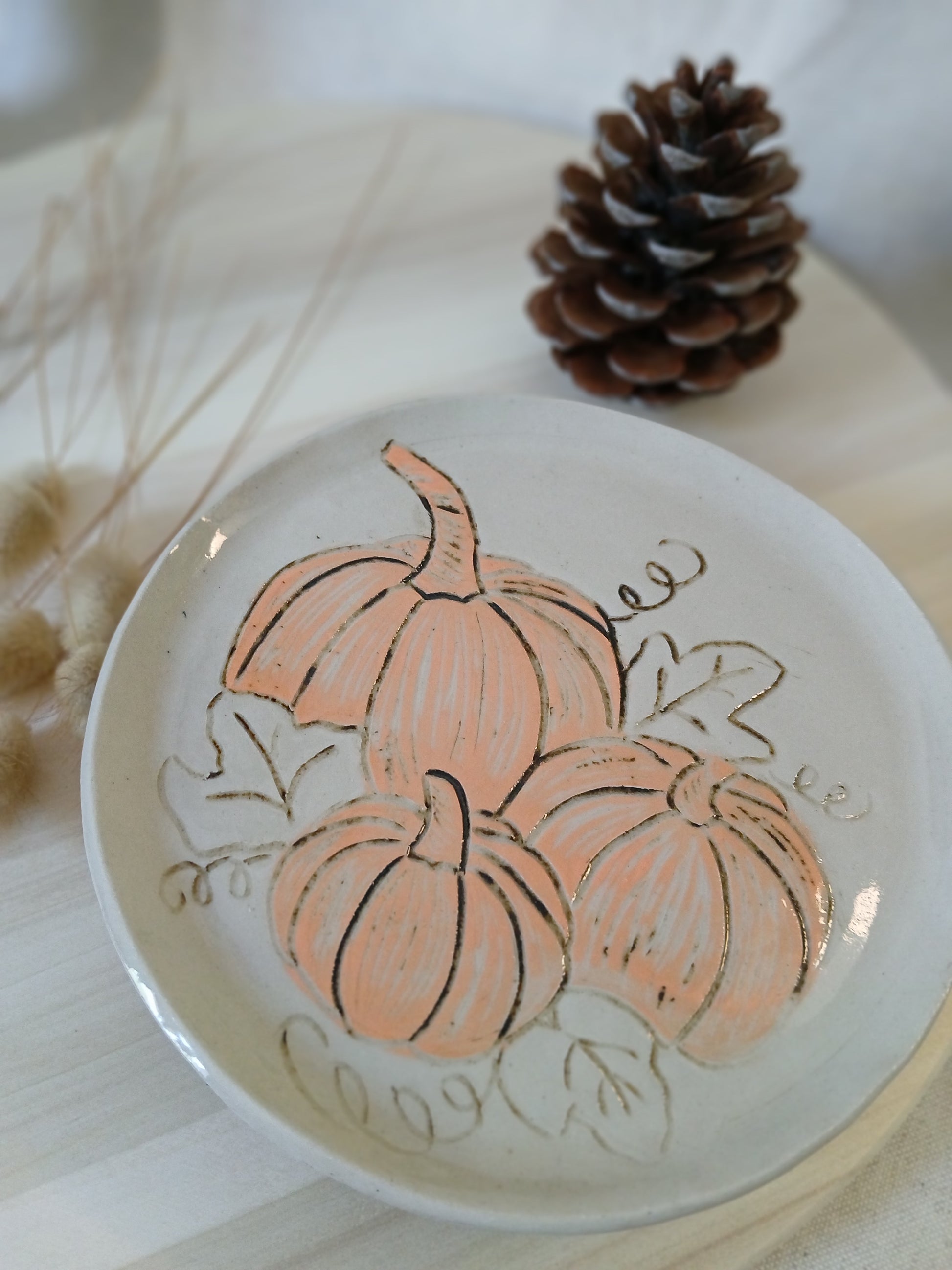 Petite assiettes au décor automnale gravé avec de belles citrouilles.
