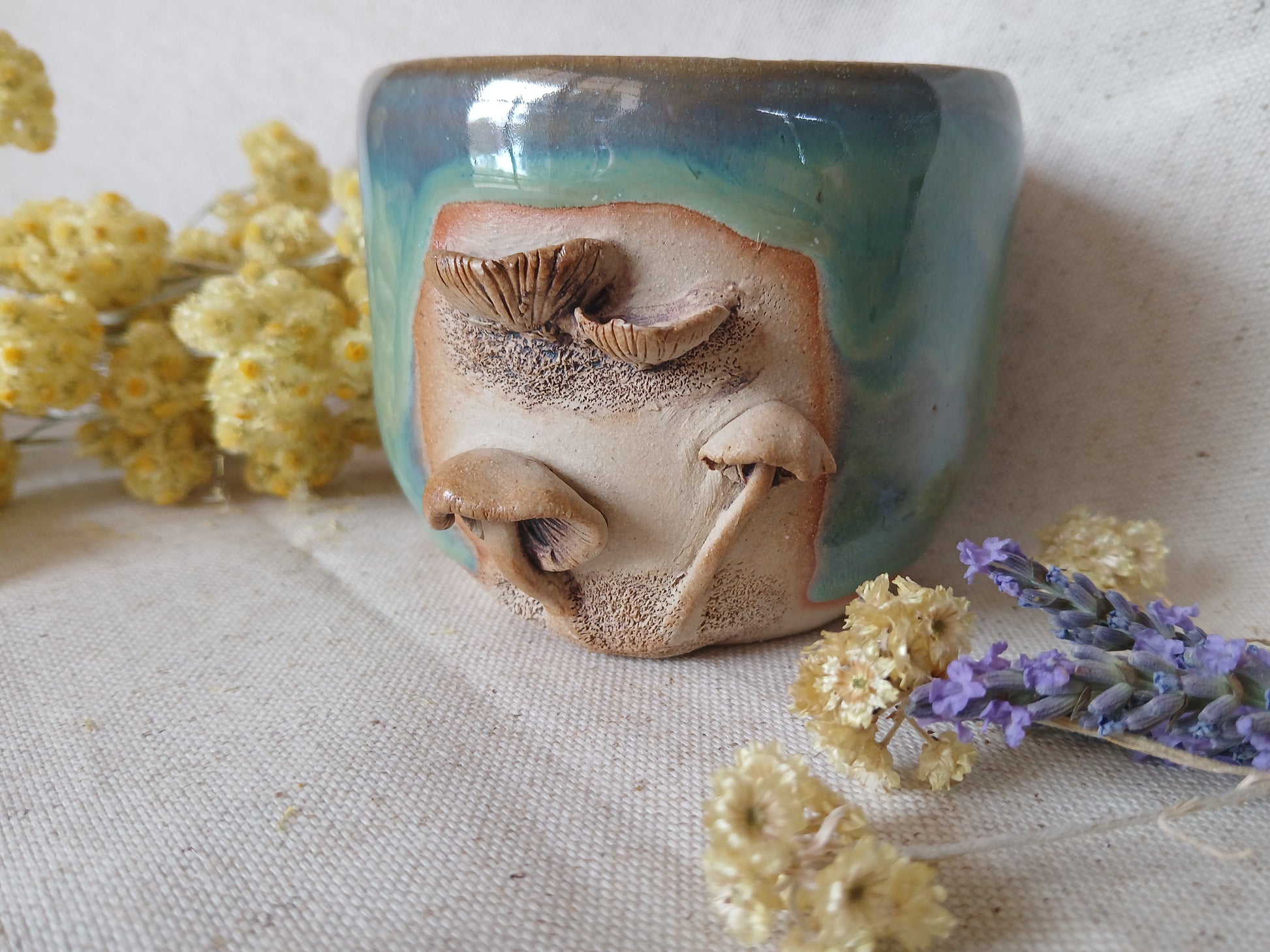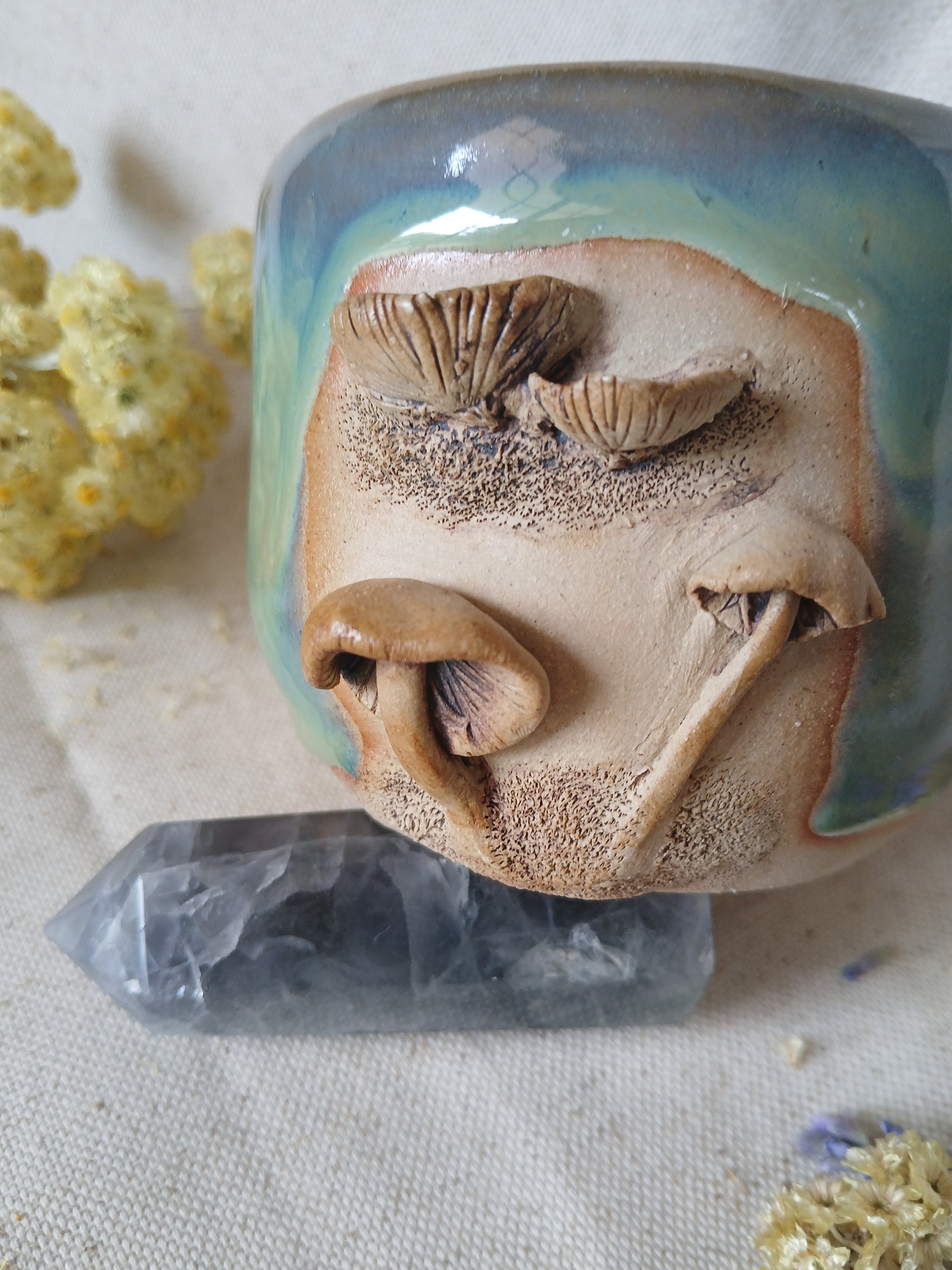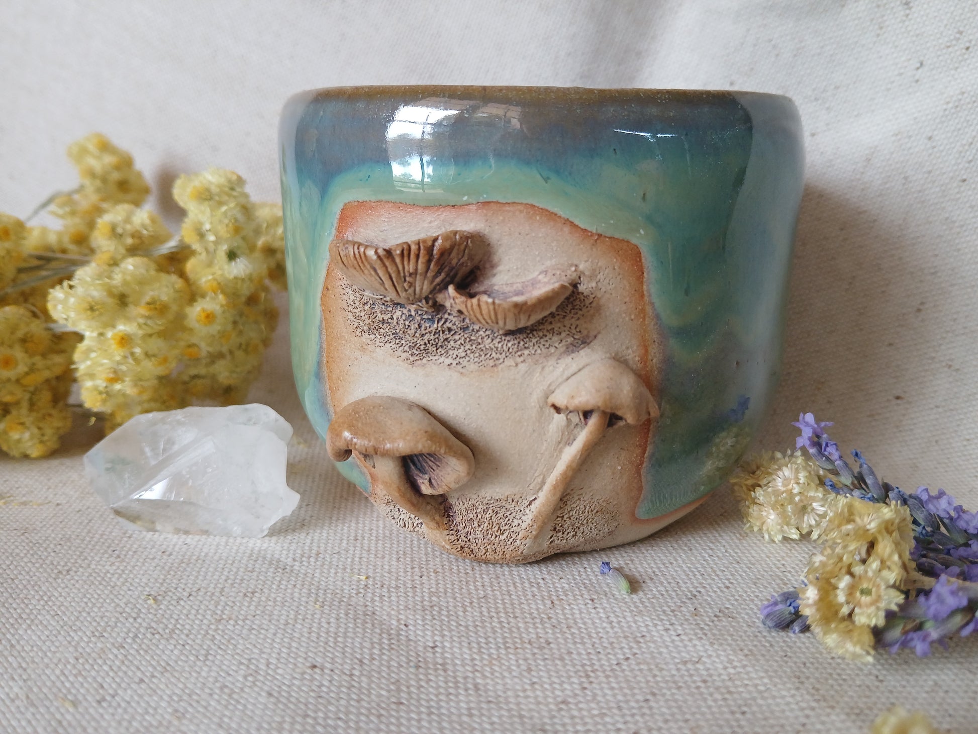 Contenant inspiré de la forêt, orné de champignons sculptés à la main, dans des nuances de vert mousse et de fougère pour une ballade au cœur des sous-bois.