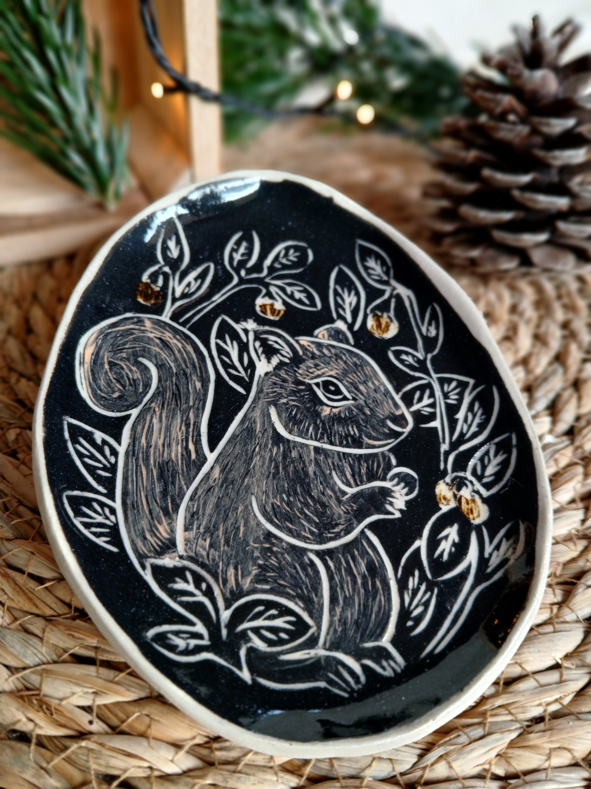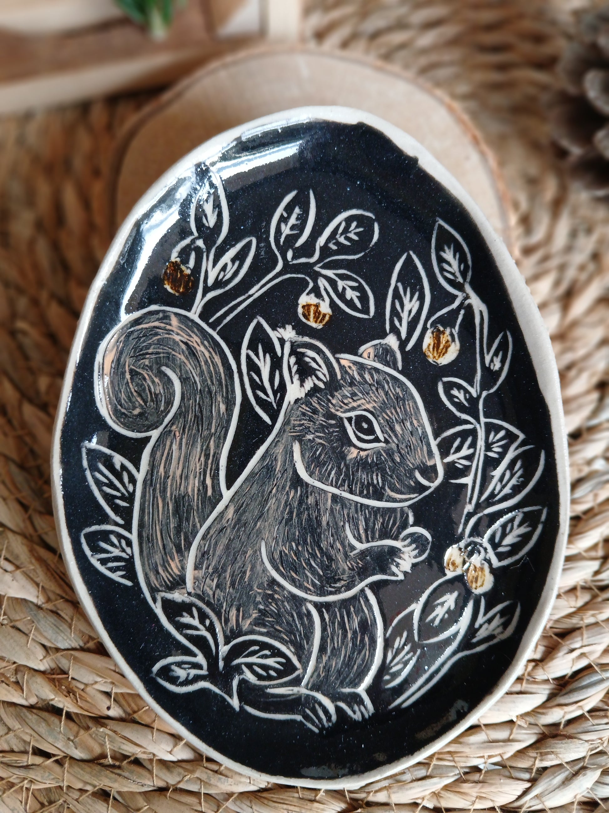 Coupelle au décor gravé d'un écureuil et de noisetiers.