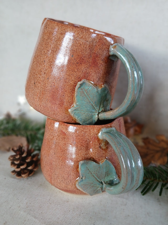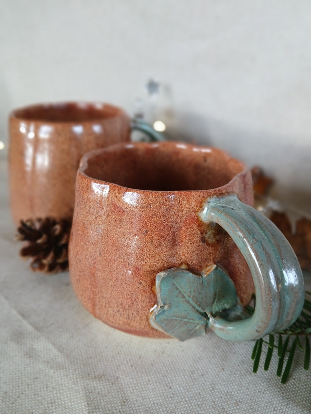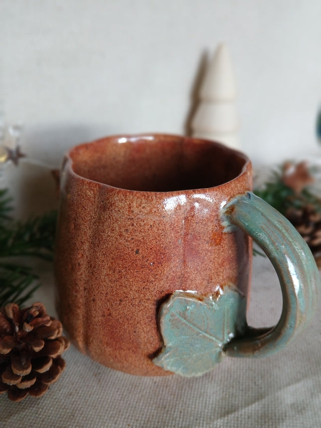Tout en rondeur, ce mug citrouille évoquent les douces récoltes d'automne. Son anse texturée est ornée d'une feuille naturelle, pressée dans l'argile pour en révéler chaque détail, comme si elle venait d'être cueillie.